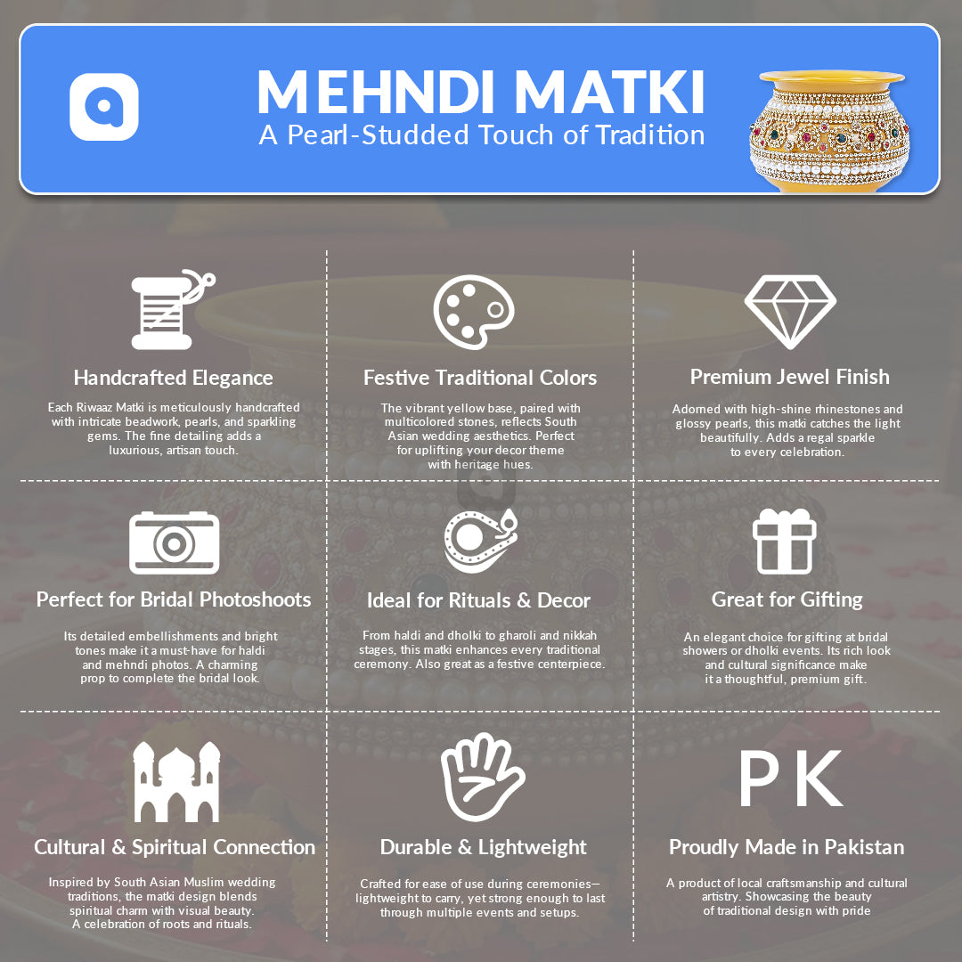 Add a traditional charm to your Mehndi or Mayoun decor with this beautifully crafted Mehndi Metal Matki. Adorned with elegant pearl detailing, this matki is perfect for holding flowers, rose petals, or simply as a decorative centerpiece. Its metallic finish and handcrafted look make it a standout item for any desi celebration.