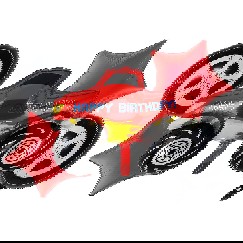 A set of 5 foil balloons is included, consisting of 1 truck balloon, 2 tire balloons, and 2 star balloons.